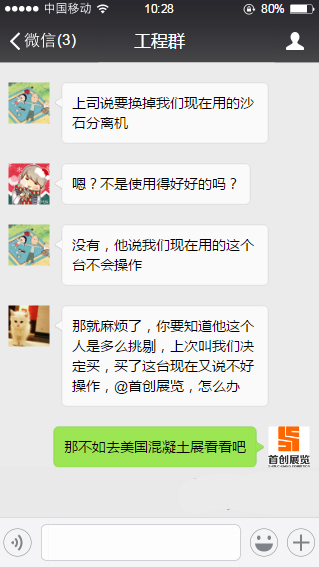 C:那就麻煩了,你要知道他這個人是多么挑剔,上次叫我們決定買,買了這臺現(xiàn)在又說不好操作。@首創(chuàng)展覽,怎么辦